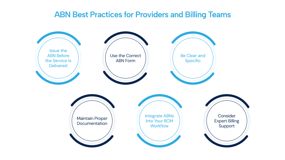 ABNs should be part of your daily revenue cycle management process. This includes identifying high-risk services, issuing ABNs in advance, tracking signed forms, and applying the correct claim modifiers such as GA, GX, GY, and GZ.
