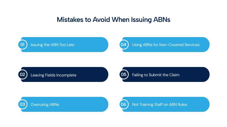 One of the most common mistakes is giving the ABN after the service or during an emergency visit. According to the Centers for Medicare & Medicaid Services (CMS), ABNs must be issued before the service is performed. If issued late, it becomes invalid, and the provider cannot bill the patient if Medicare denies payment.
